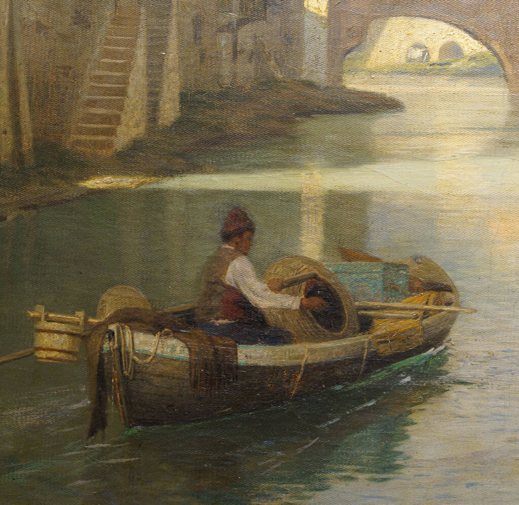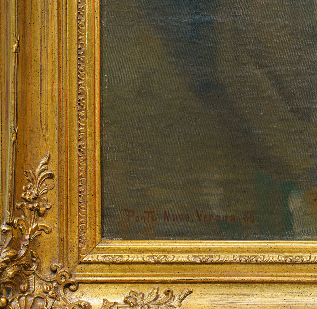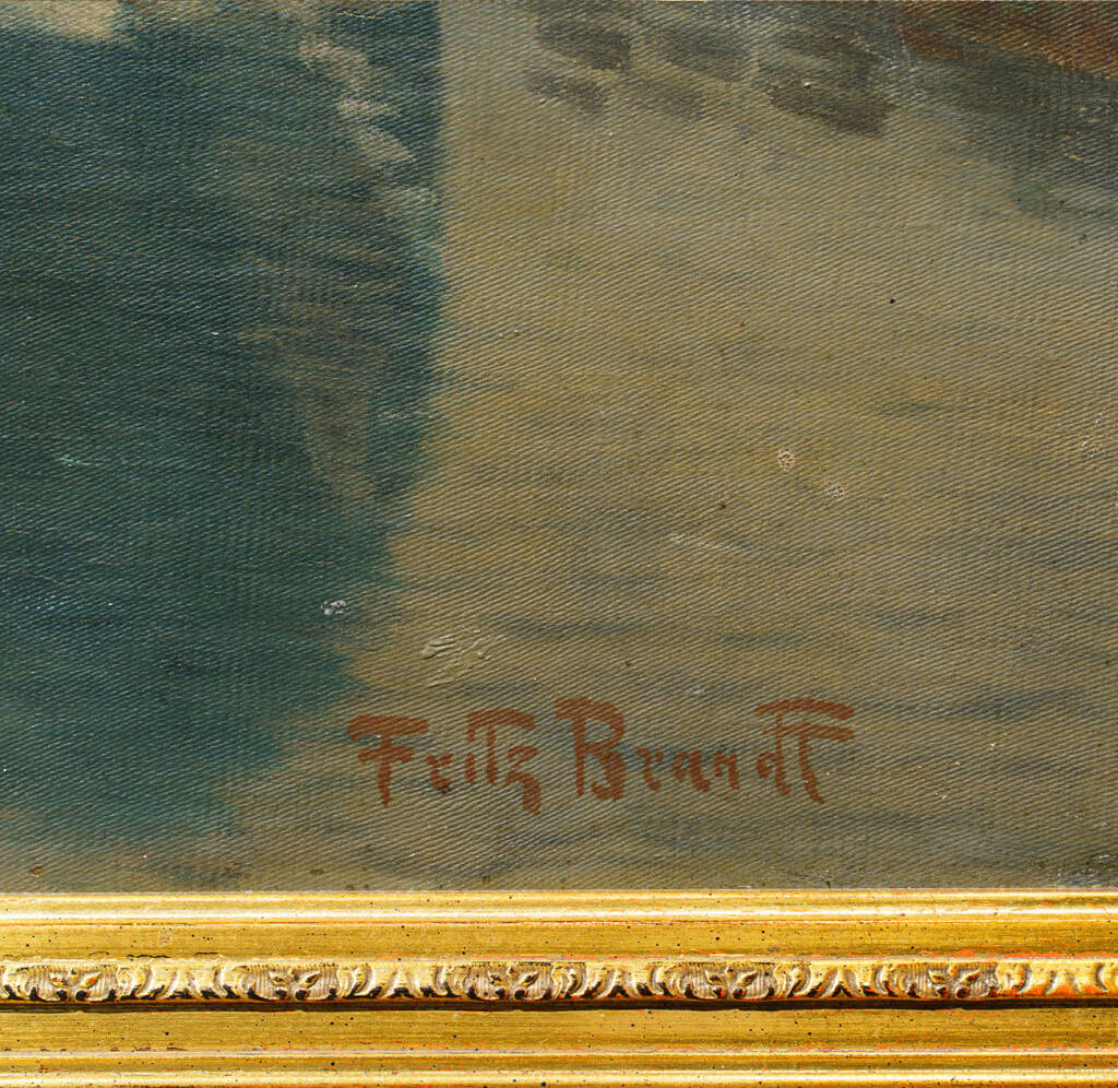 La luce calda del pomeriggio veronese, riflessa sulle facciate e sull’acqua, testimonia l’influenza della scuola veneziana e toscana dell’Ottocento, filtrata attraverso la sensibilità nordica dell’autore. L’opera, firmata e datata “Fritz Brandt / Ponte Nave, Verona, 88” in basso a destra, rappresenta una delle più raffinate interpretazioni ottocentesche del paesaggio urbano veronese.