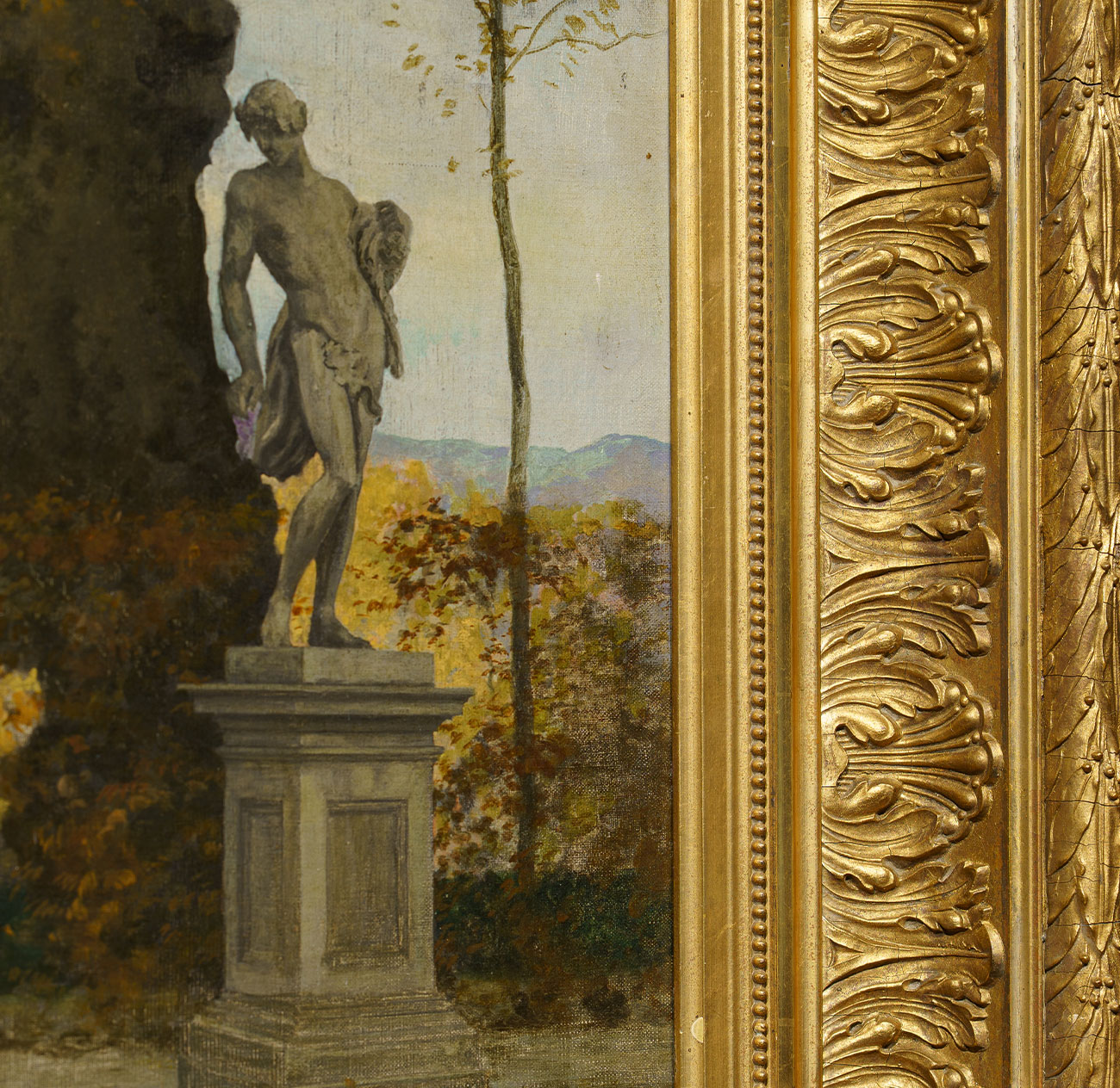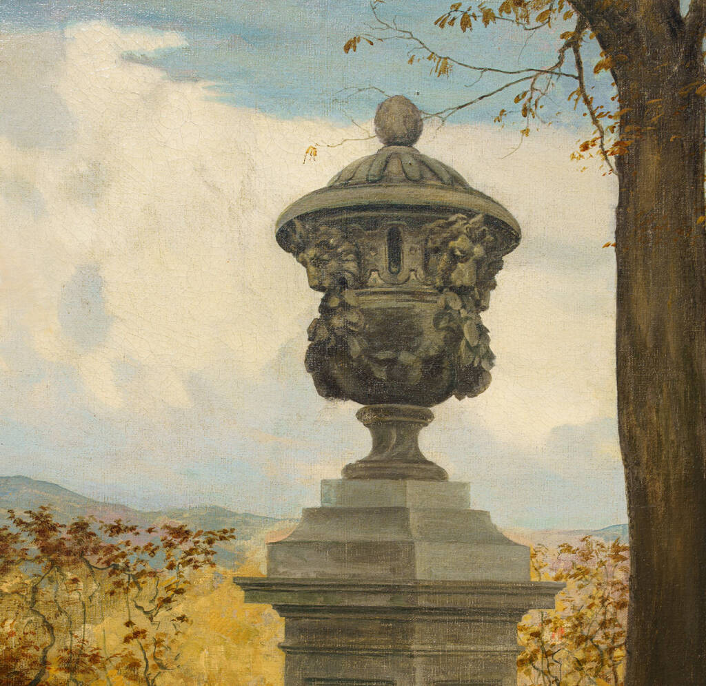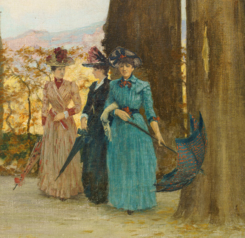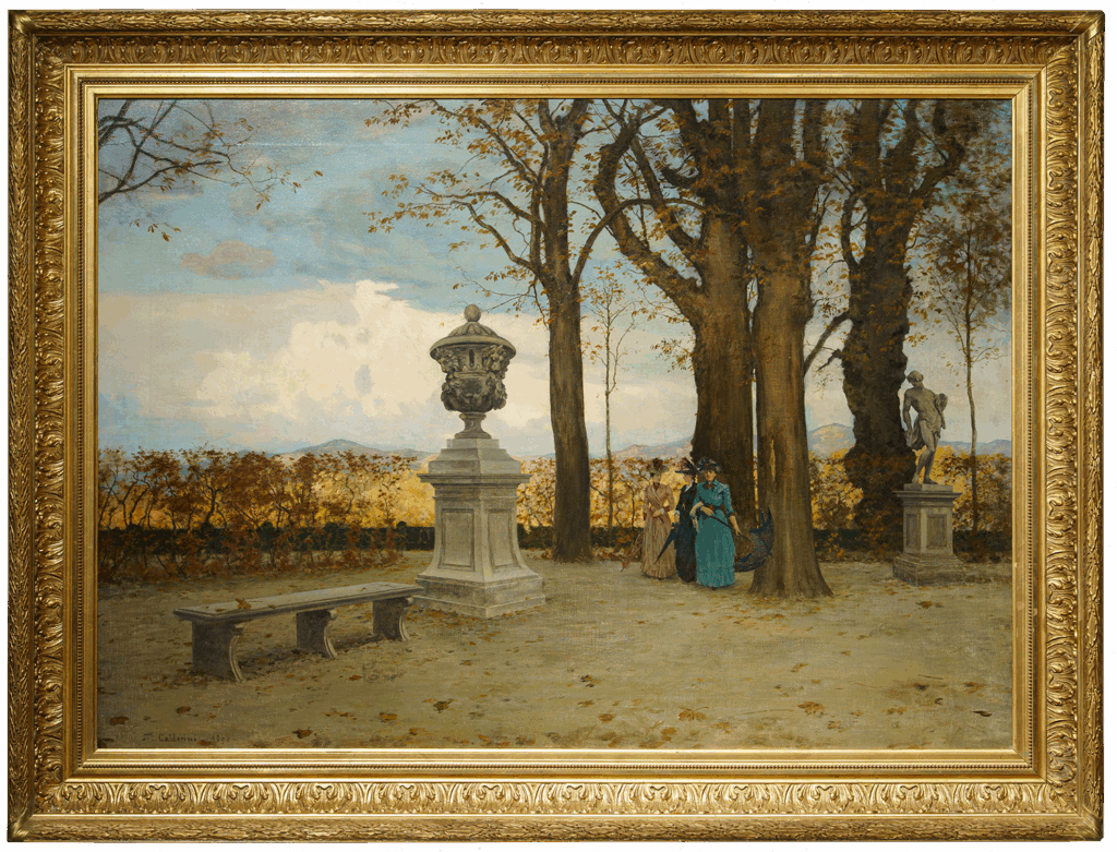 Ampia veduta di giardino ottocentesco firmata P. Calzona, pittore attivo tra la fine del XIX e gli inizi del XX secolo, noto per le sue scene di vita borghese immerse in paesaggi eleganti e luminosi. L’opera raffigura un parco autunnale animato da tre giovani donne in abiti d’epoca che passeggiano tra grandi alberi secolari, sculture classiche e urne ornamentali. La composizione, equilibrata e misurata, combina il gusto decorativo per la scena all’aperto con un raffinato studio della luce e della prospettiva.
